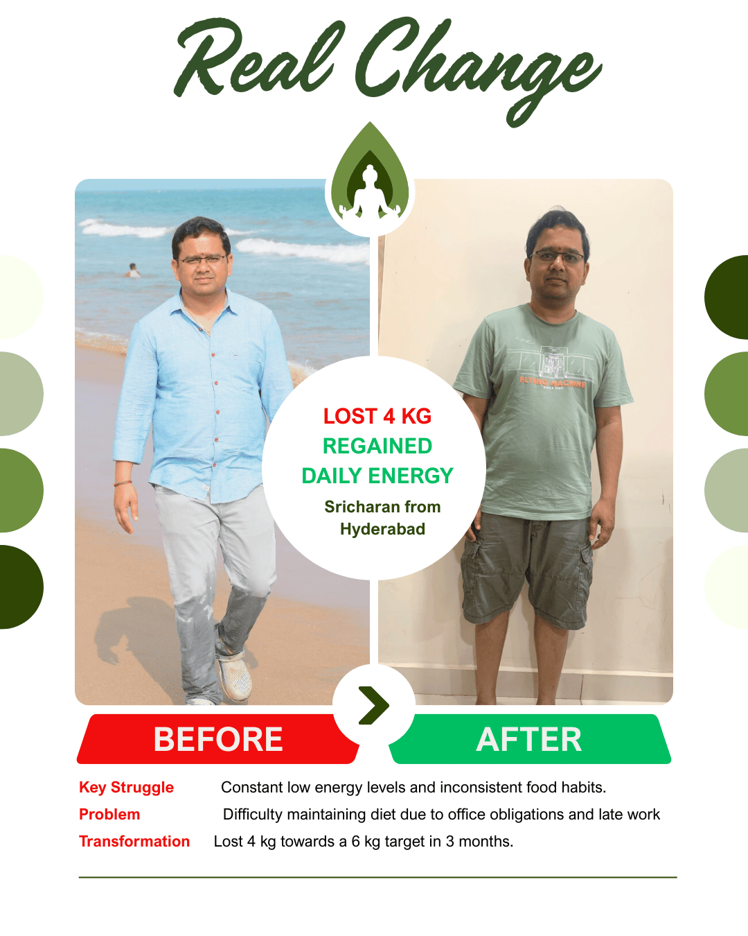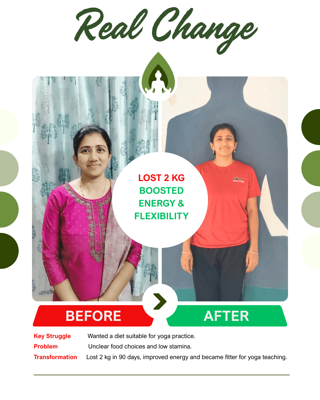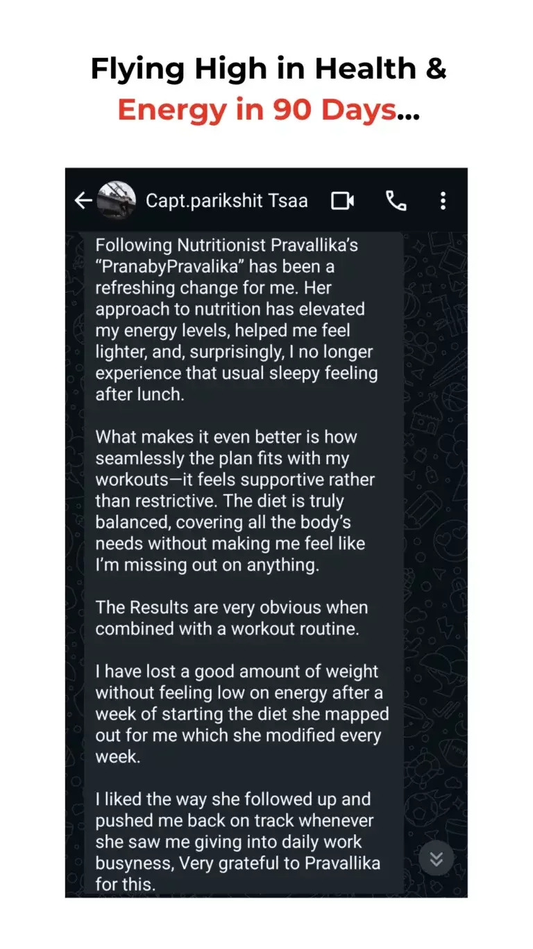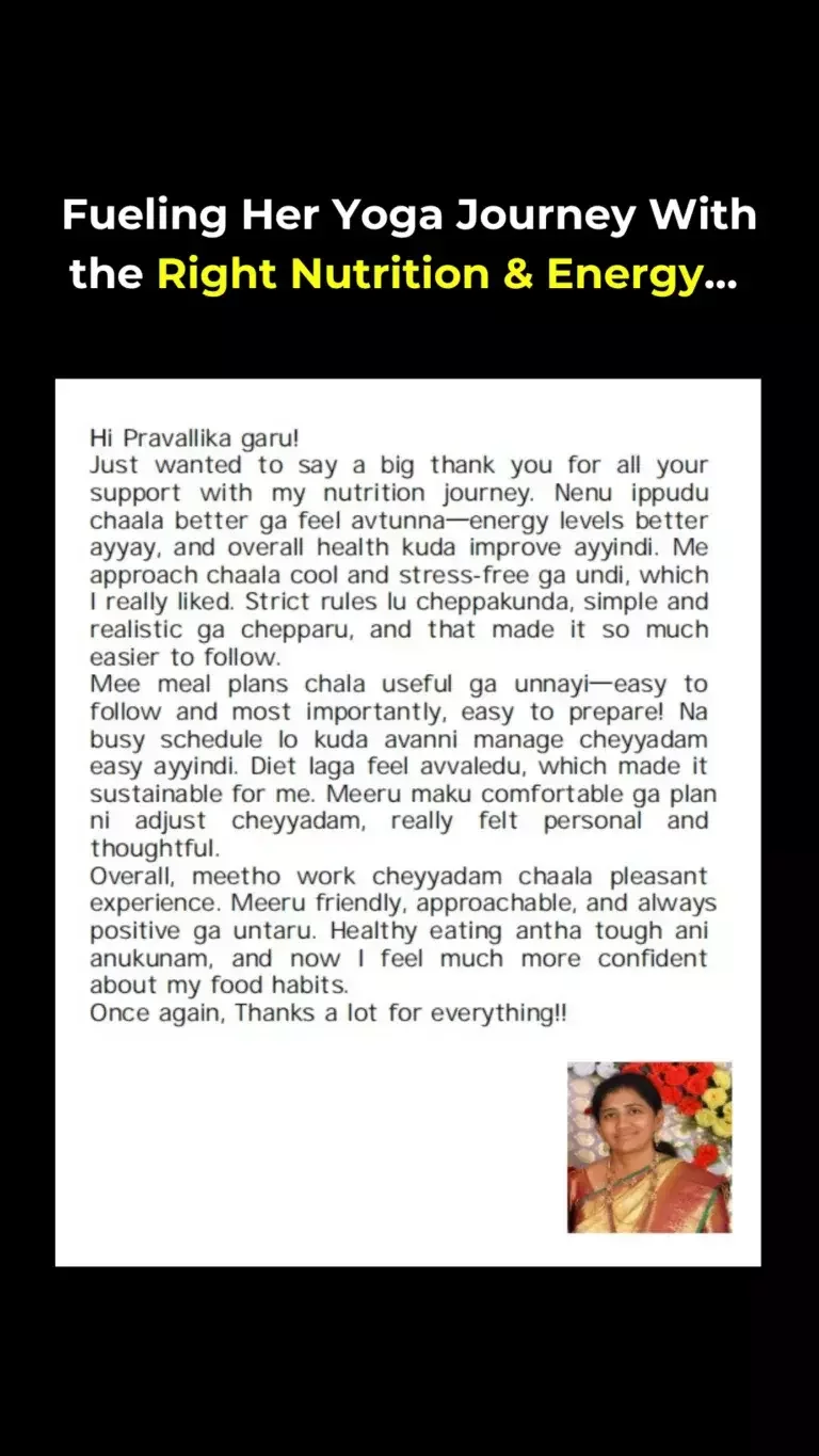As a yoga practitioner preparing to teach, I was confused about what to eat to sustain my energy. The Strategy Call gave me clarity on how to structure my meals and stay consistent. In 90 days, I lost 2 KGs, feel more energized, and can now pursue my yoga journey with confidence.